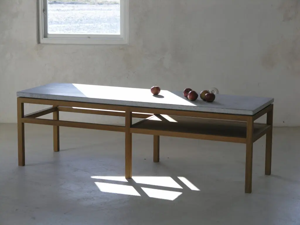 Benen är något indragna, vilket skapar en elegant silhuett och ett luftigt intryck. Bordet finns i flera storlekar, med eller utan hylla. Den integrerade hyllan ger ett extra lager av funktion utan att ta fokus från formen. En perfekt plats för böcker, magasin eller vardagliga ting. Alla delar sammanfogas och slipas för hand – en möbel som håller formen, känslan och funktionen över tid.